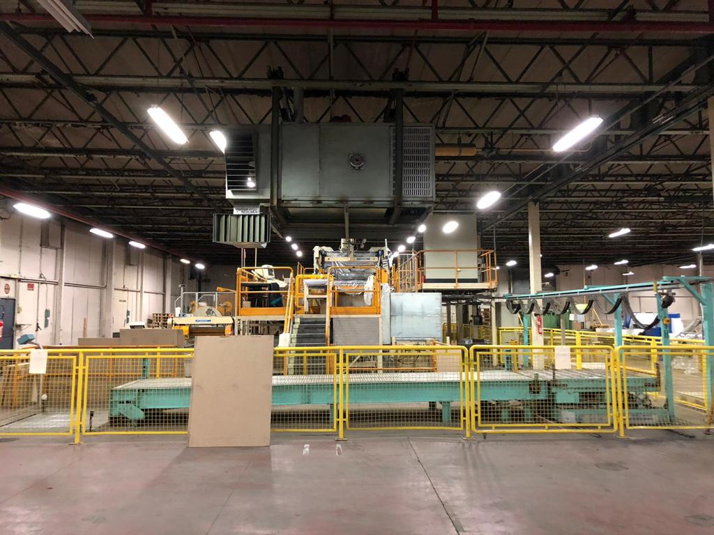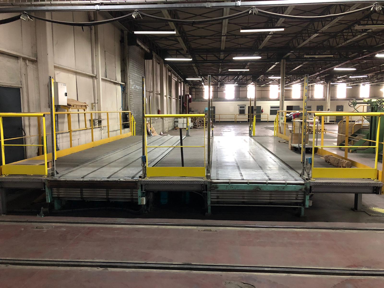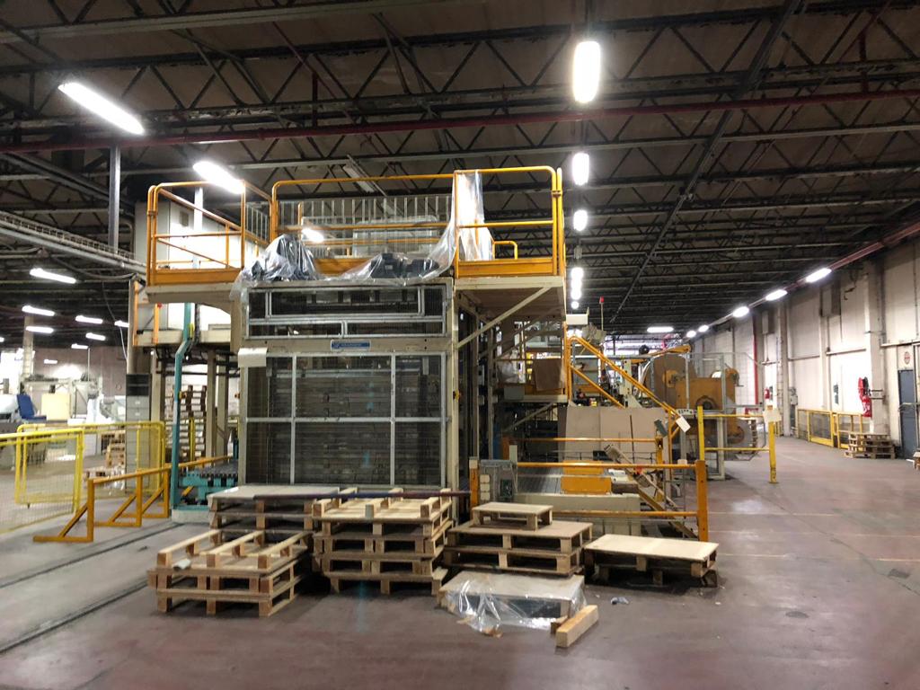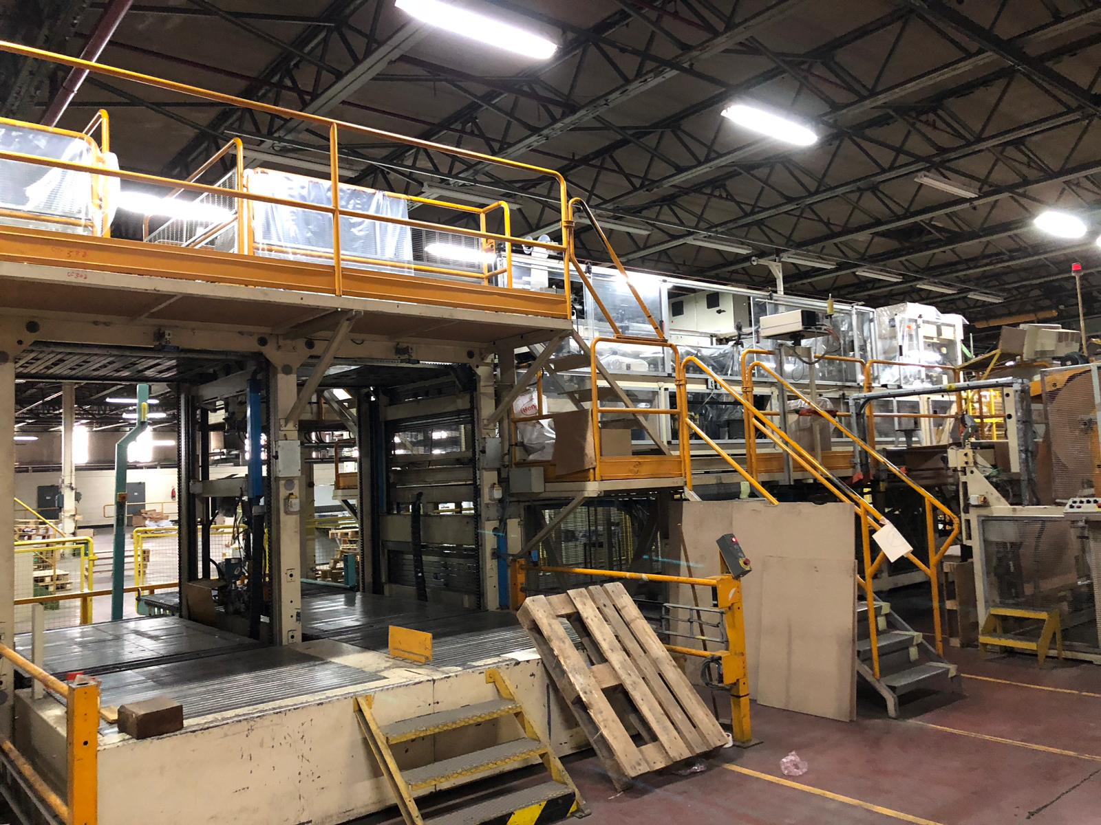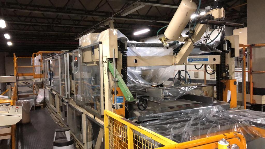 Enrameuse automatique Format emballage: Mini: 420 X 530mm Maxi: 1000 X 1400mm Hauteur palette max: 1800mm Bobine emballage: laize mini 650mm, maxi:1600mm sur mandrins: 75 – 100 – 150mm 2 personnes pour conduire cette machine 25 tonnes par 8 heures Emplacement au sol: 30m X 30m Hauteur: 6m environ Année: 1991